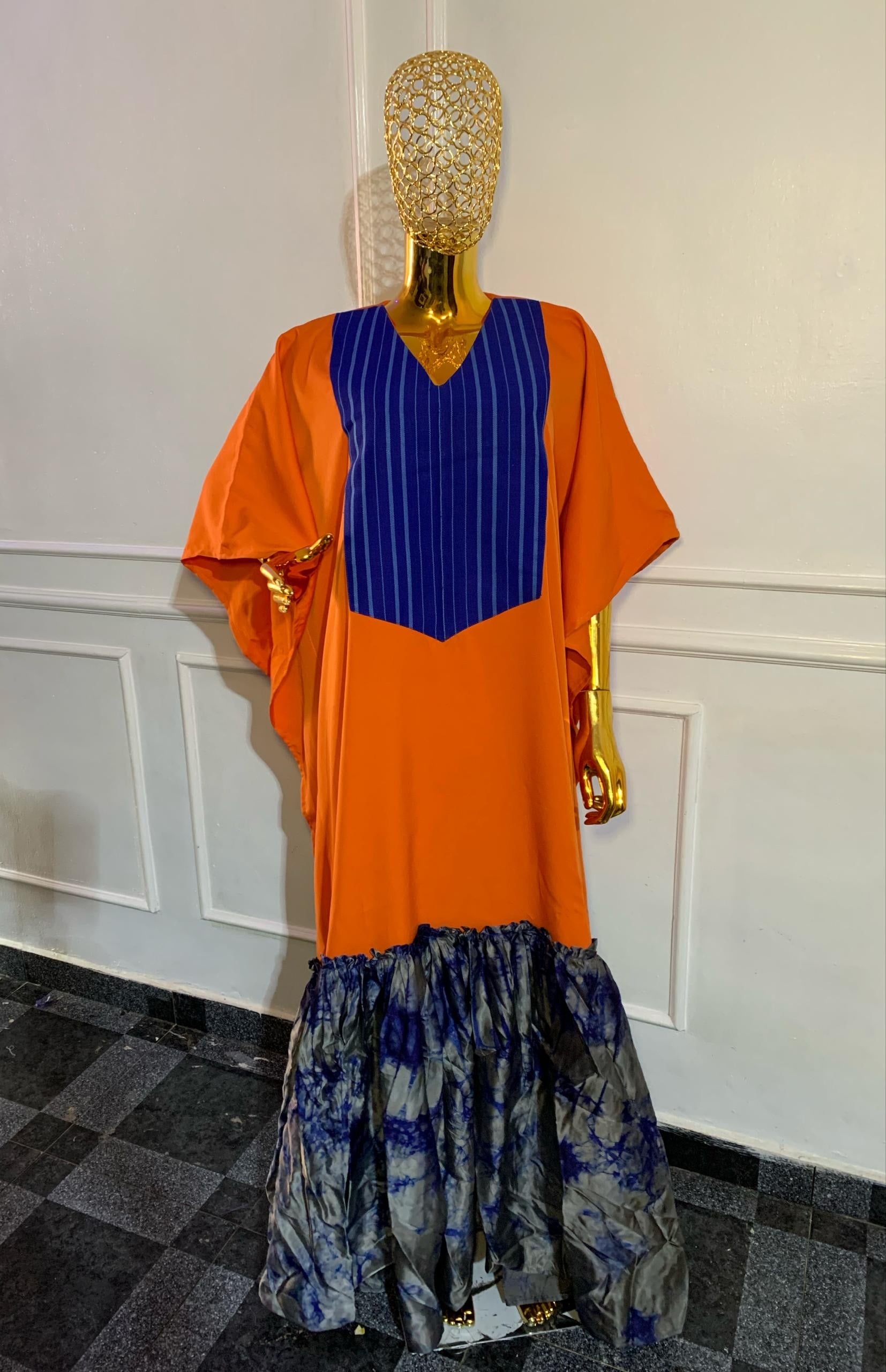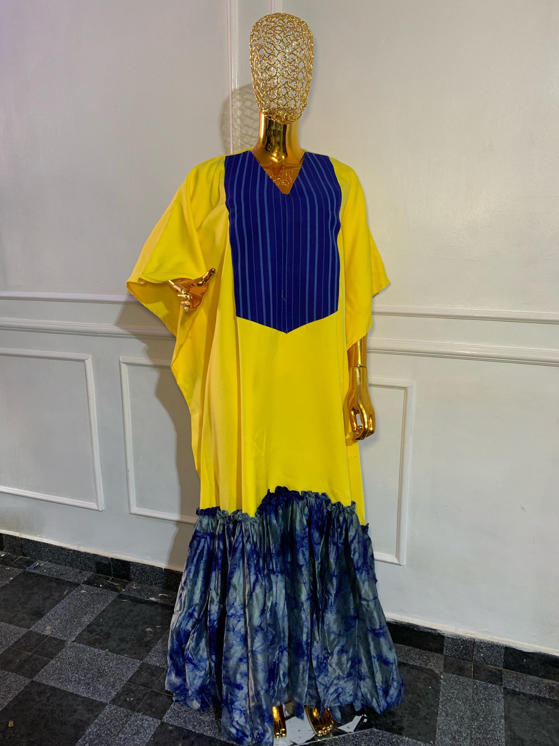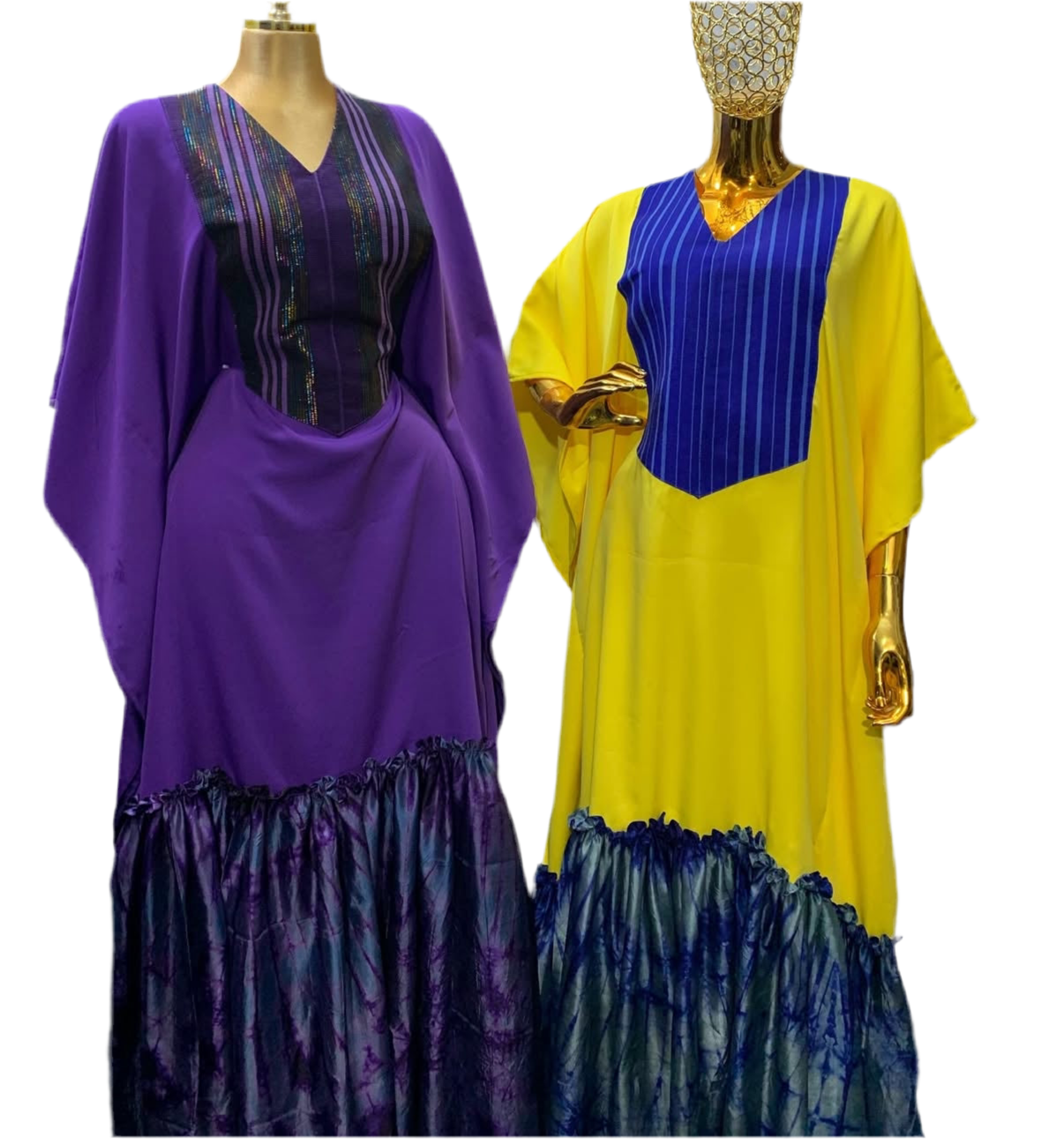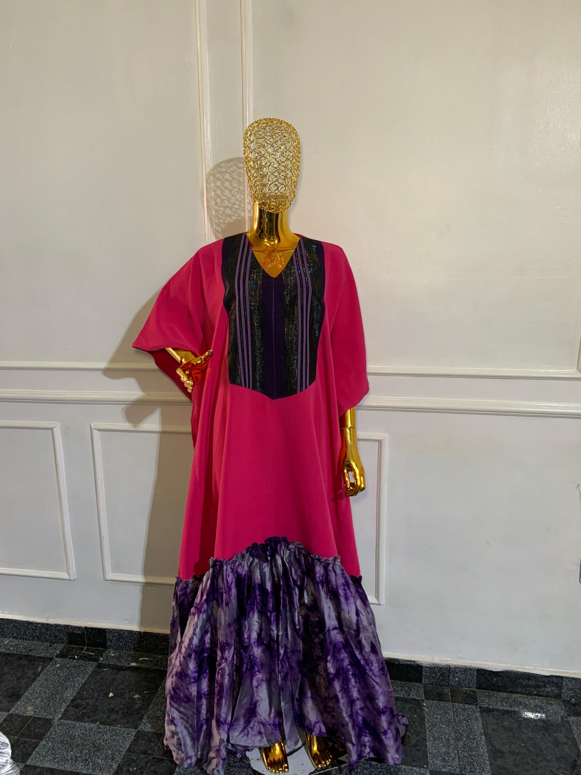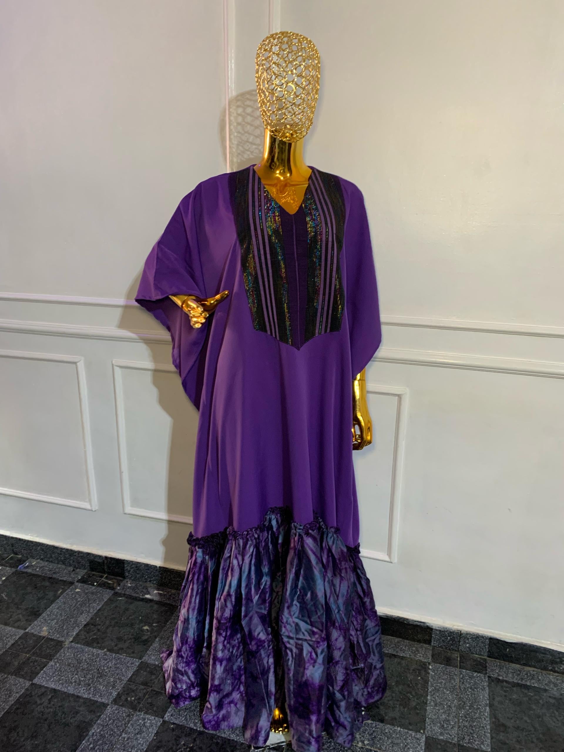 - A rich, royal ensemble featuring a striking V-neckline adorned with multicolor vertical embellishments. The flowing silhouette cascades gracefully, with a beautifully gathered tie-dye hem.